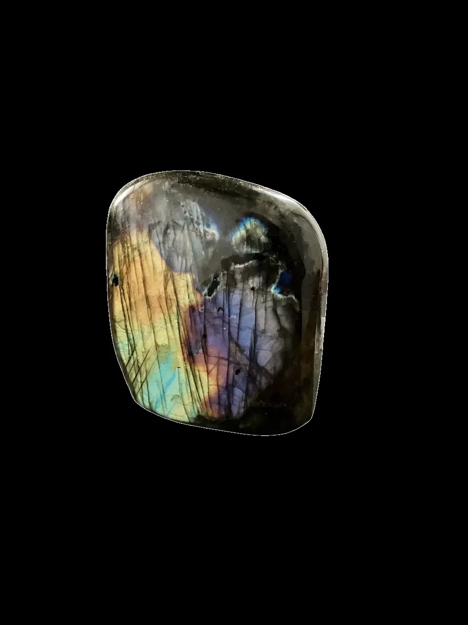 La Labradorite est une pierre de protection très puissante qui absorbe les énergies négatives, très souvent utilisée par les thérapeutes, les soignants. J'ai d'ailleurs pu constater qu'elle trônait souvent sur les bureaux de praticiens ou encore d'avocats.